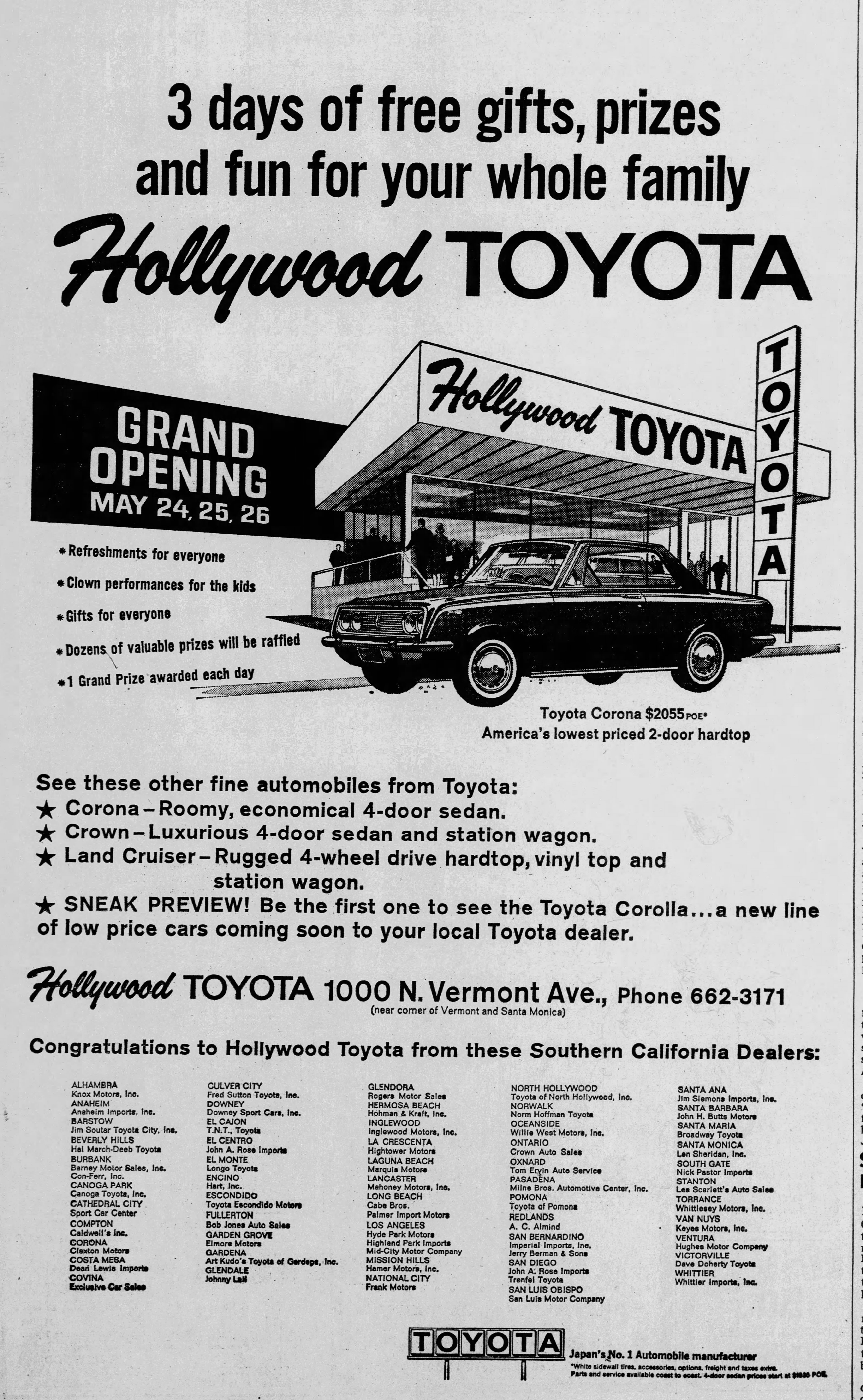 Hollywood Toyota moved to a new building at 1000 N. Vermont Avenue May 24-26, 1968, and later moved again to 6161 Hollywood Boulevard- the onetime home of A. E. England Pontiac.