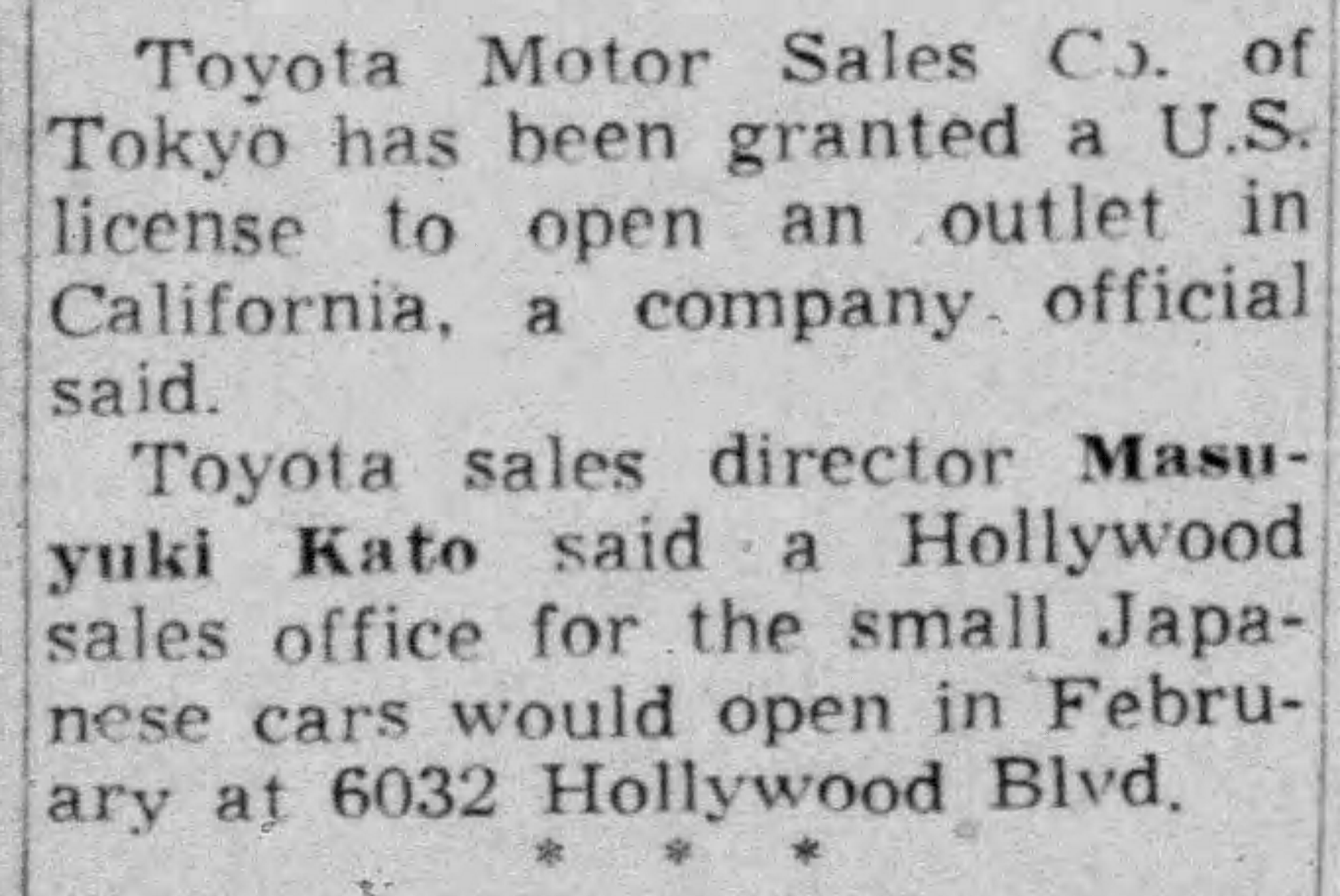 In July 1957, Reuters and other news correspondents reported that the Toyota Motor Company of Nagoya, Japan was to begin exporting its Toyopet passenger cars in the USA, an attempt to capture the growing market her for smaller, more fuel efficient cars. Toyota officials scouted locations and decided that Hollywood was the ideal place to open its first dealership.
