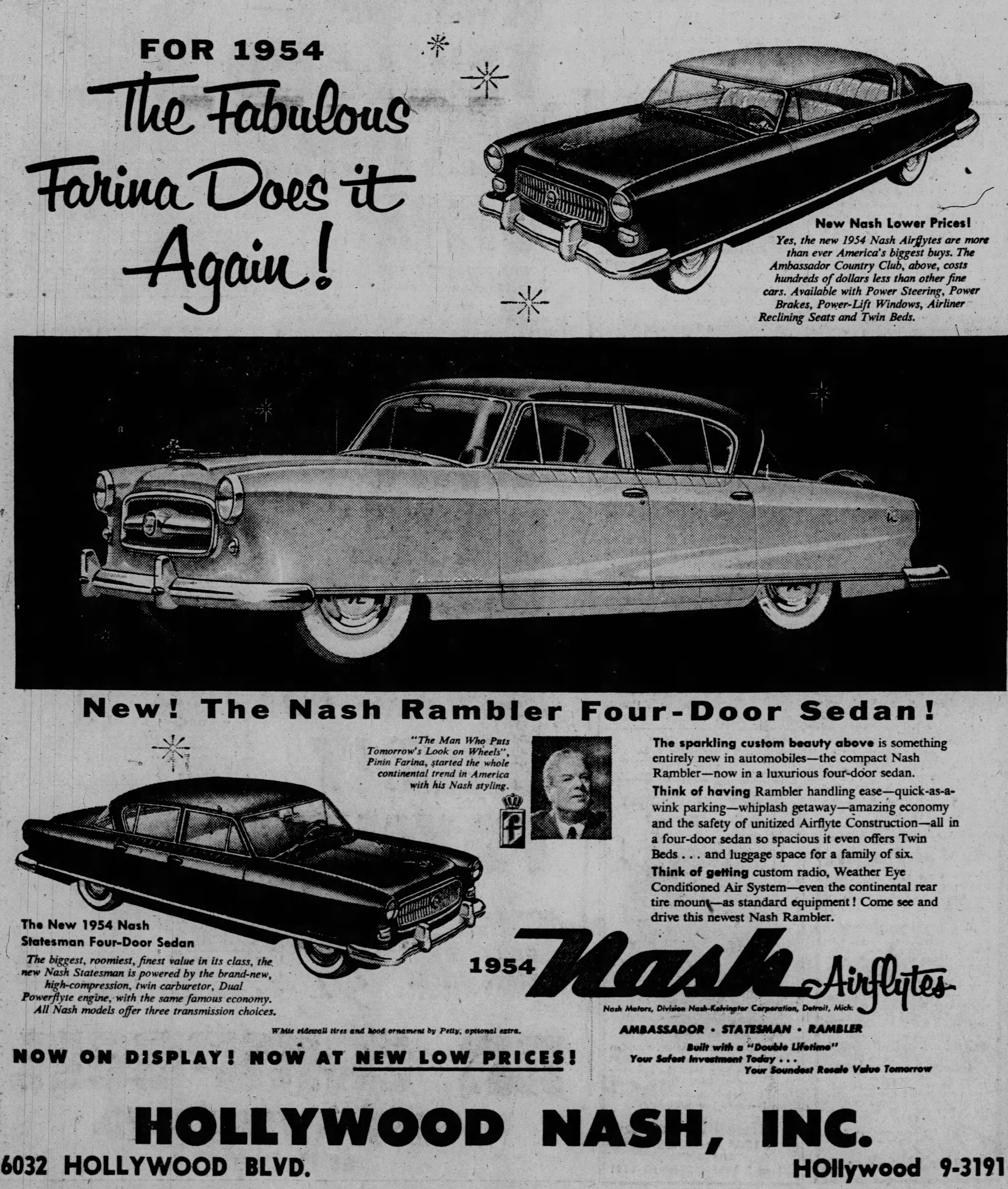 “The Fabulous Farina” is a reference to Italian auto designer Battista “Pinin” Farina who worked as a consultant for Nash on the 1952-1954 models. Citizen News 12/1/1953.
