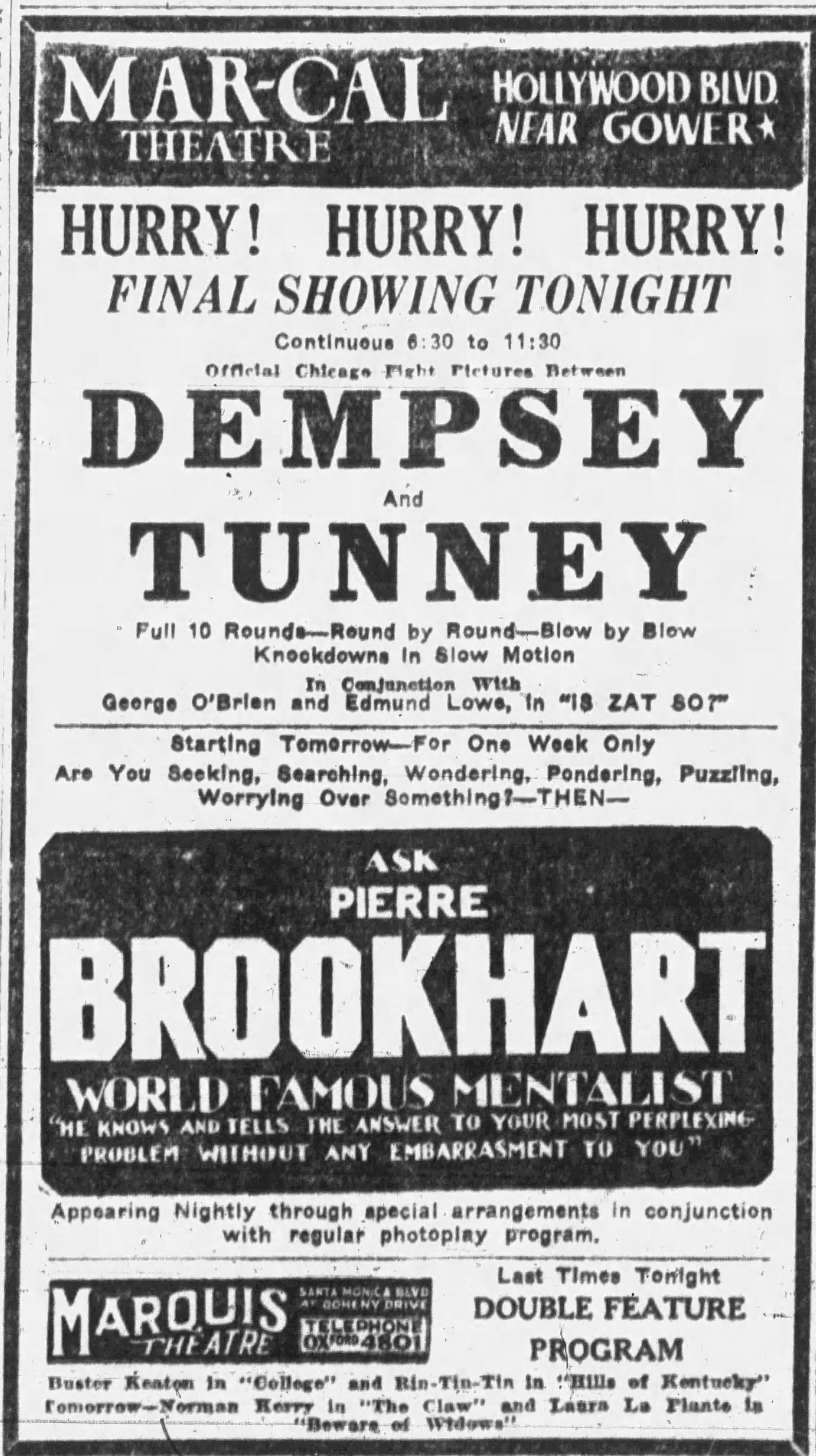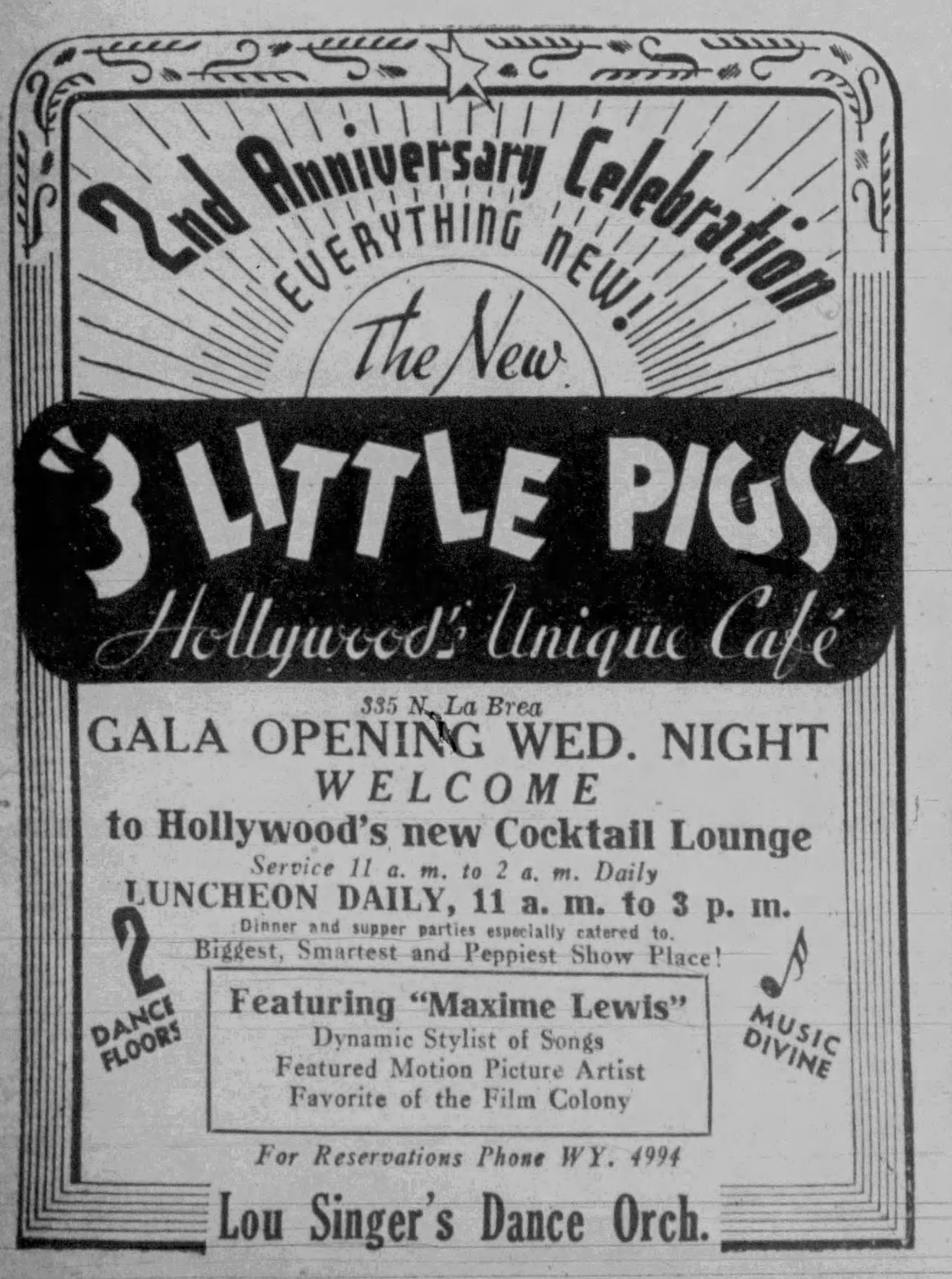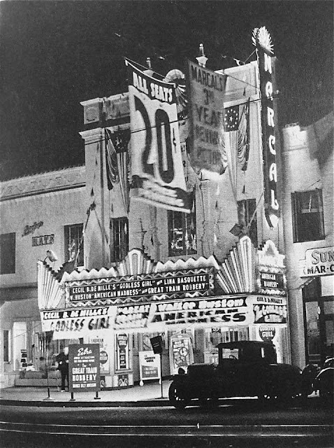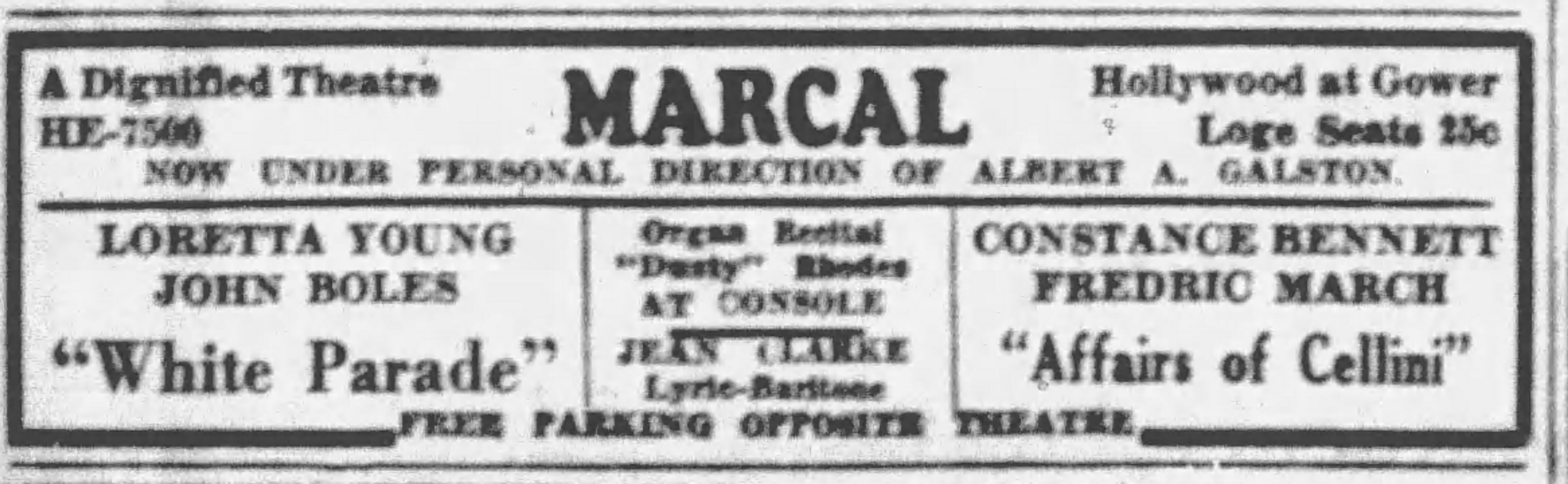 This section of the Boulevard was still fairly undeveloped at this point. The south side of the block was largely devoted to auto dealerships interspersed by the shaded lawns of the Mountain View Inn. Across the street, there was the Marcal Theater and some small retail buildings but the rural Brokaw property was still undeveloped, but for a defunct miniature golf course. That would change between the years 1936 and 1940 when the Palms Grill, Hawaii Theater, Florentine Gardens and Hollywood Food Mart were built.