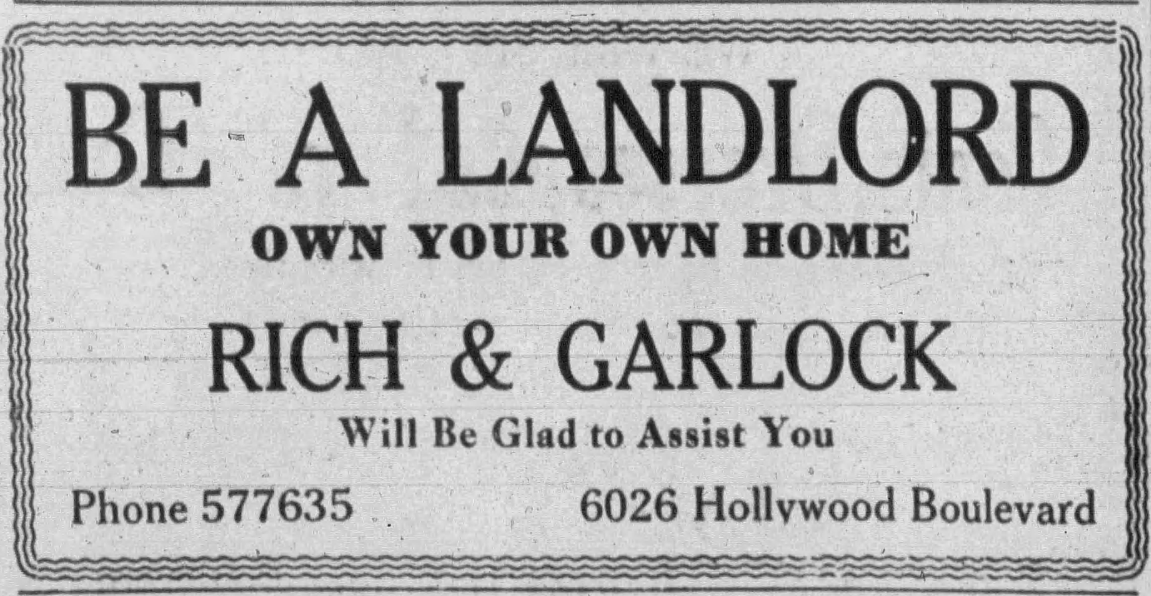 The parcel was vacant until 1920 when siblings Frank Rich and Bessie Rich Garlock had a 1-story retail building constructed here. With space for 5 retail stores, it was addressed as 6030-6032-6034-6036-6038 Hollywood Boulevard. Rich & Garlock were the adult children of Edwin Rich, who owned the adjacent parcel (see 6028 Hollywood Boulevard). Their uncle was Sanford Rich, of 6048 Hollywood Boulevard, who had been mayor of Hollywood from 1904 to 1905 before it was annexed by the City of Los Angeles in 1910.