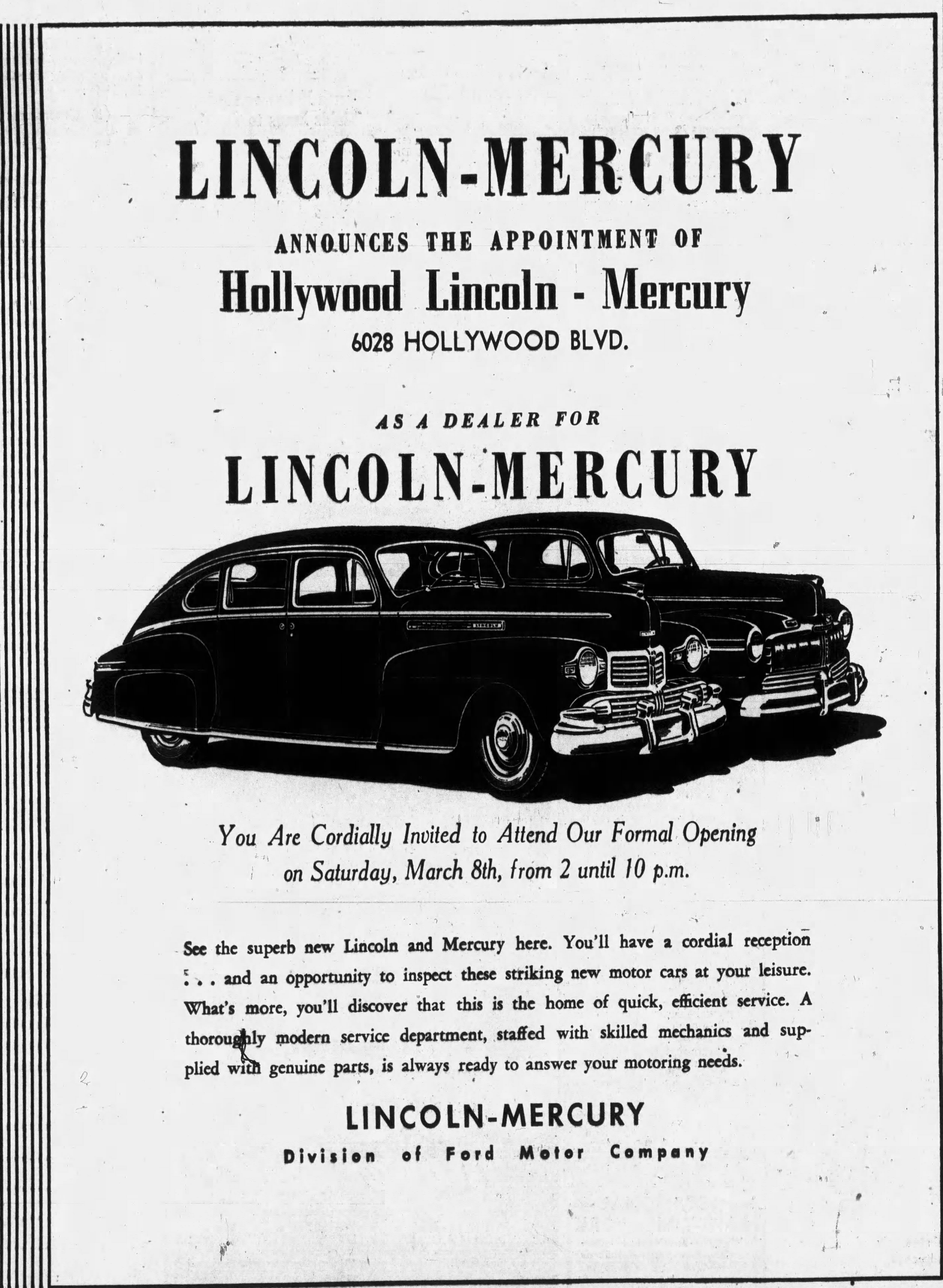 In November 1950, manager Ted Faull announced that a modernization and reorganization of the space was nearing completion. Customers would now be able to enter the service department from Hollywood Boulevard but would exit onto Carlton Way, thereby avoiding traffic on the Boulevard. This indicates the dealership must have been routing customers along the south (rear) part of the property, and to the east past 6028 and 6000 Hollywood Boulevard to the alley called Brokaw Place that connected Hollywood Boulevard to Carlton Way between 6000 and the Mountain View Inn at 5956 Hollywood Boulevard.