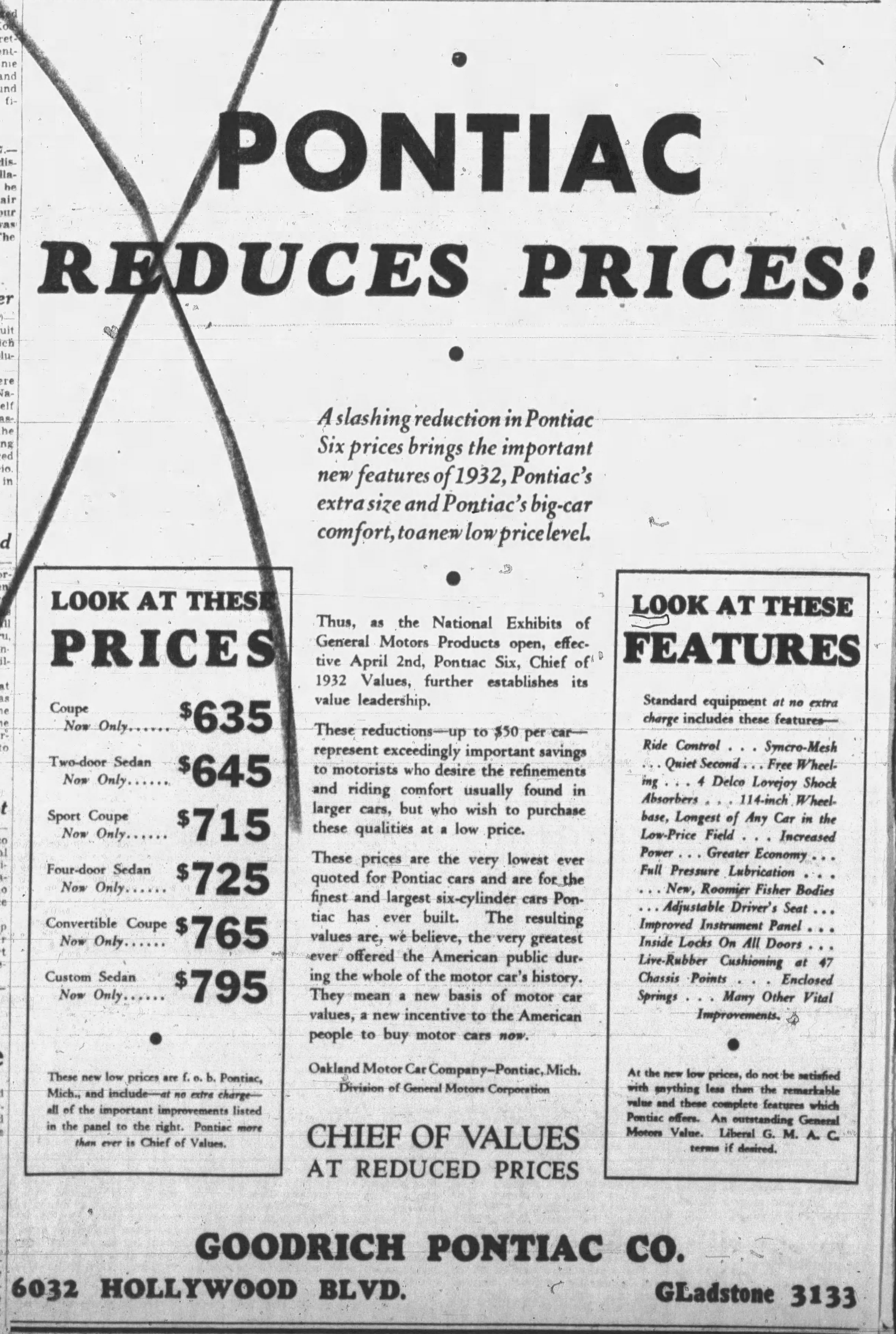 H. H. Goodrich, president of Leo Coryell, Inc., took over the dealership in April 1932, now selling the Pontiac only as GM phased out the Oakland in 1931. He was only in business briefly and closed out the shop in November 1932.