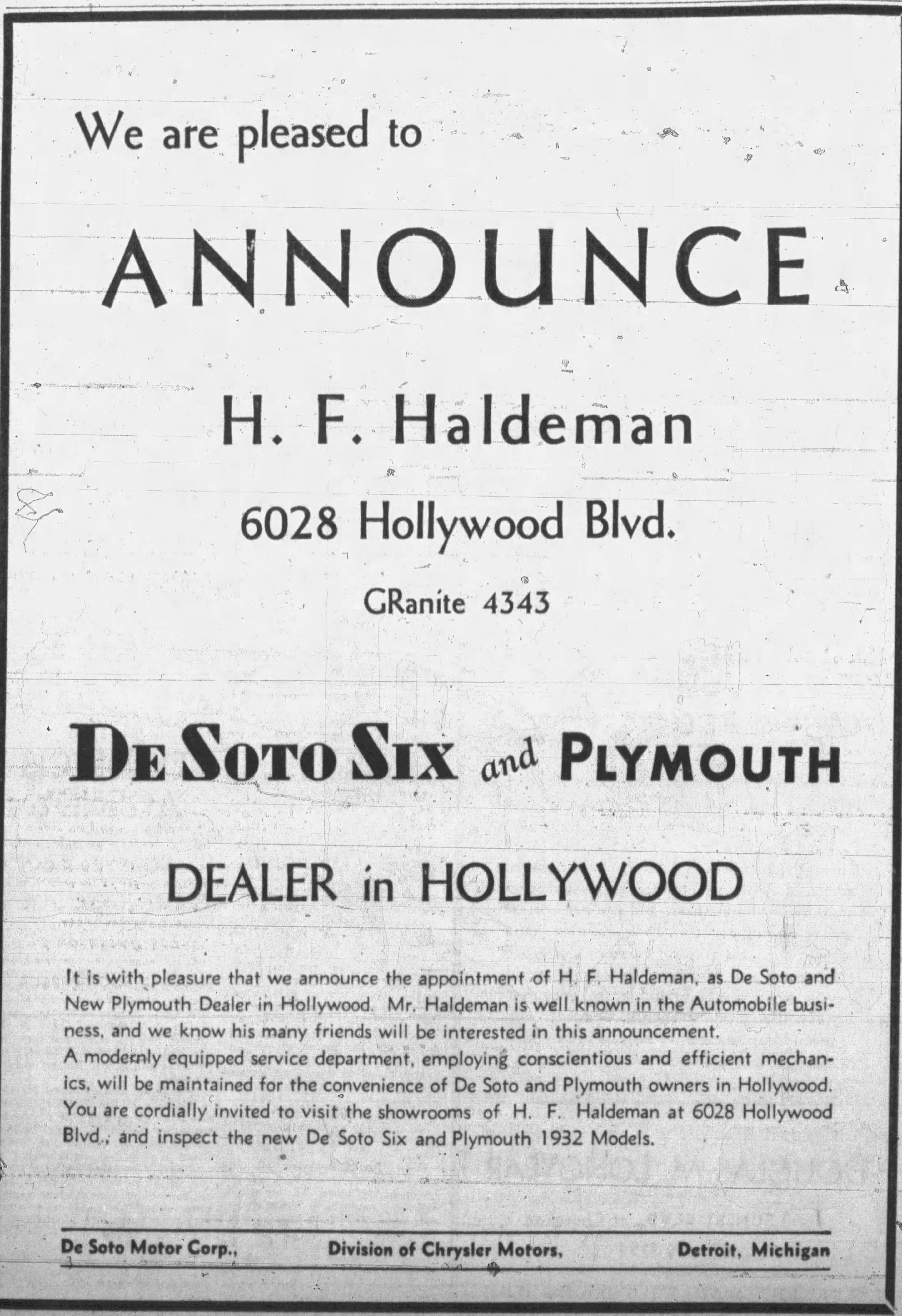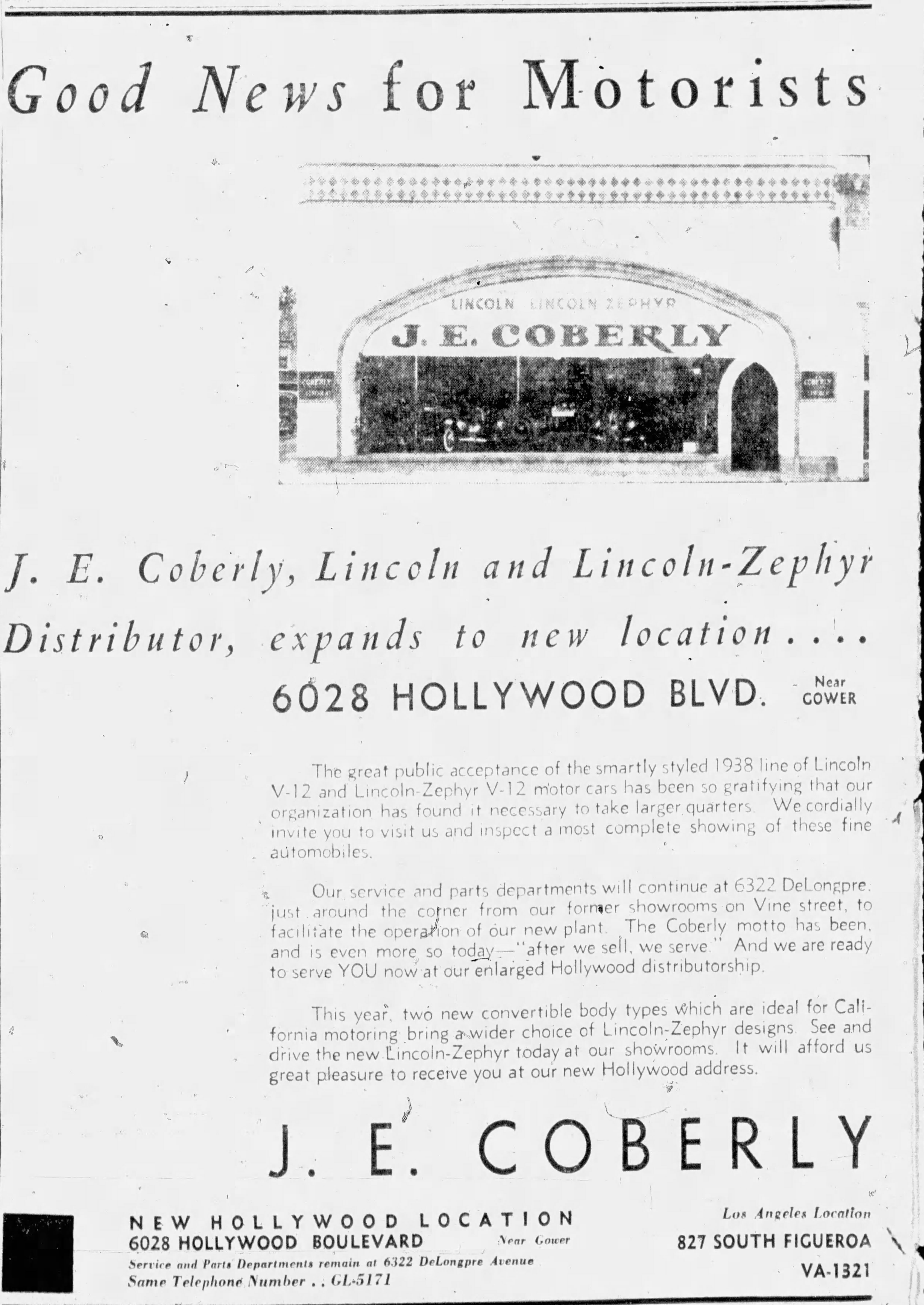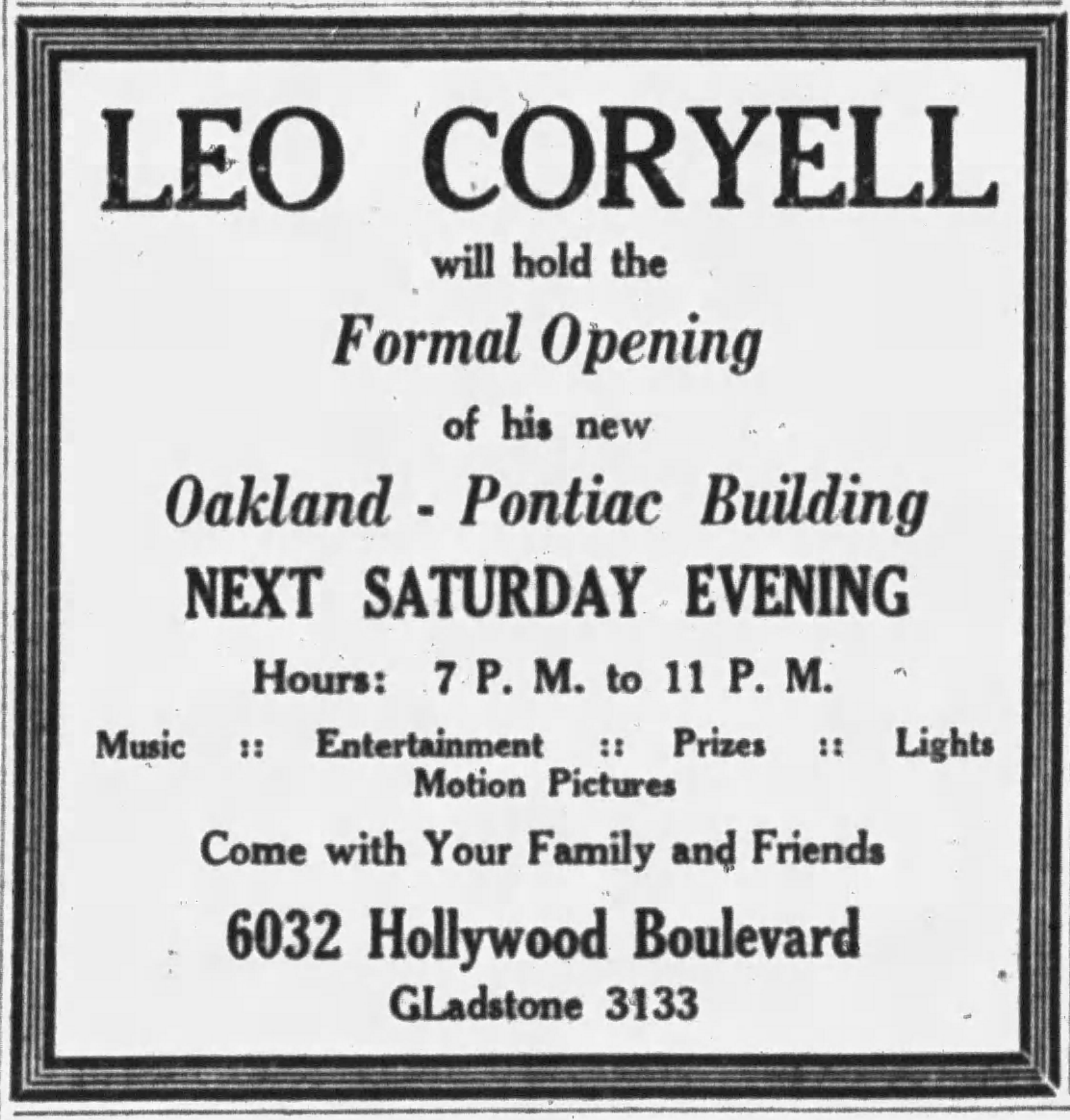 On June 2, 1928, local papers announced that the property had been leased to Leo G. Coryell, Hollywood Oakland-Pontiac dealer.
