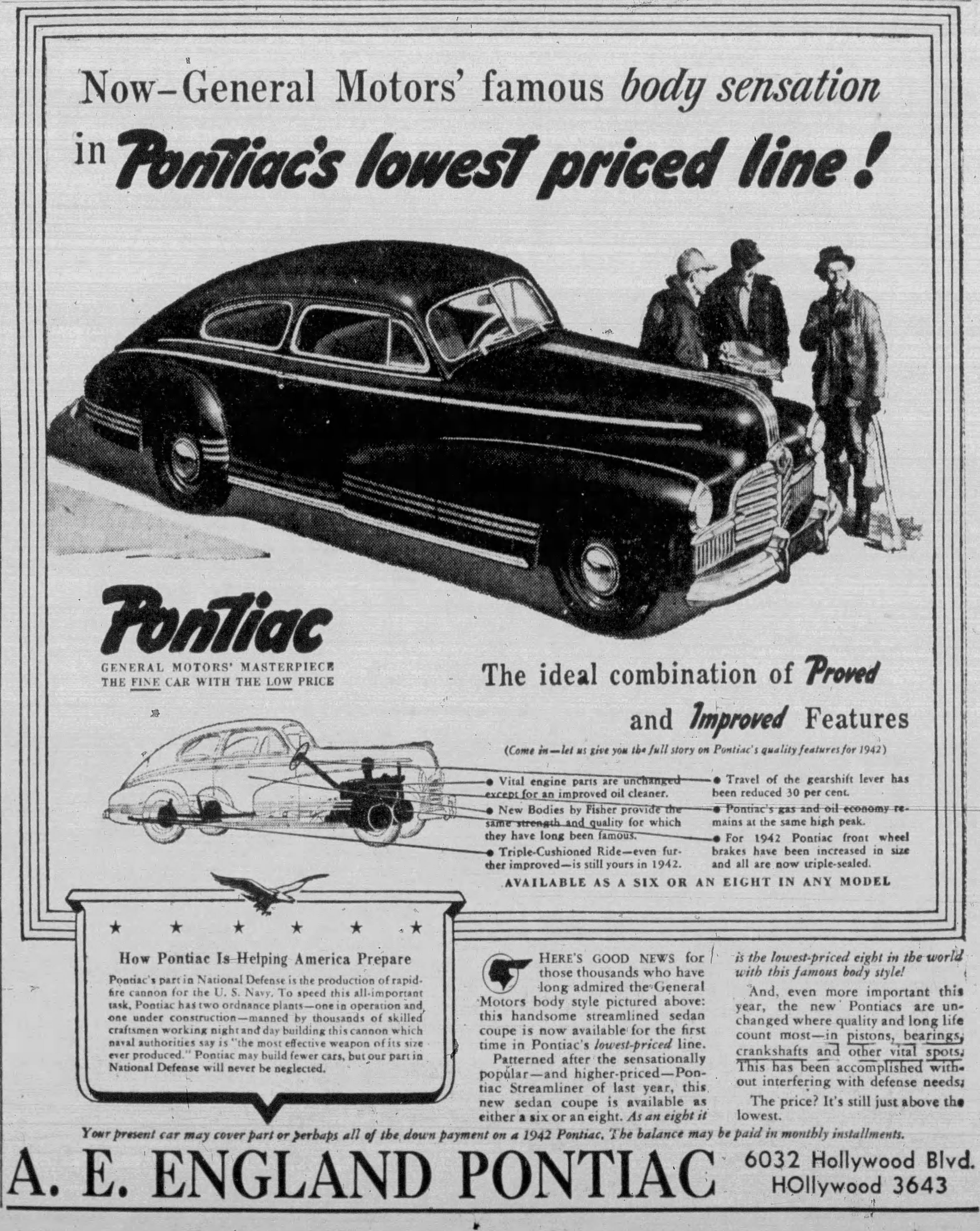 Many auto manufacturers like Pontiac were already working on military contracts prior to the US entry into World War II. Domestic auto production shut down in February 1942 as the auto industry turned 100% to the war effort. Dealers like A.E. England focused on maintaining and repairing existing cars in the service departments and buying and selling used models.
