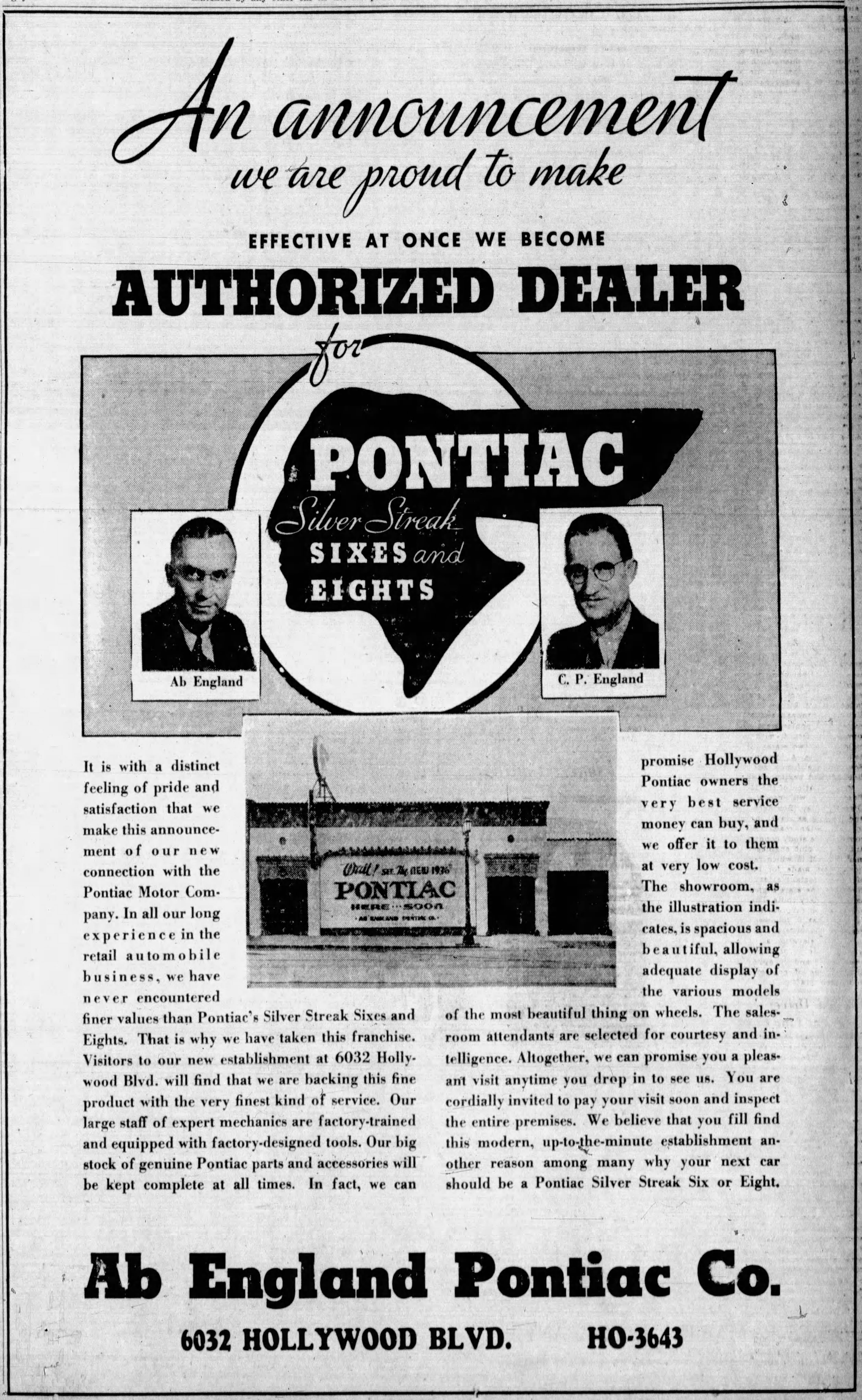 In October 1935, 6032 again became a Pontiac dealership when Pontiac dealer A. E. (Ab) England announced that he was moving into what he called “one of the finest and best equipped automotive establishments in the movie capital.” England and his brother C.P. England came to Hollywood from Phoenix, where they’d been in the auto business with their uncle O.T. England.