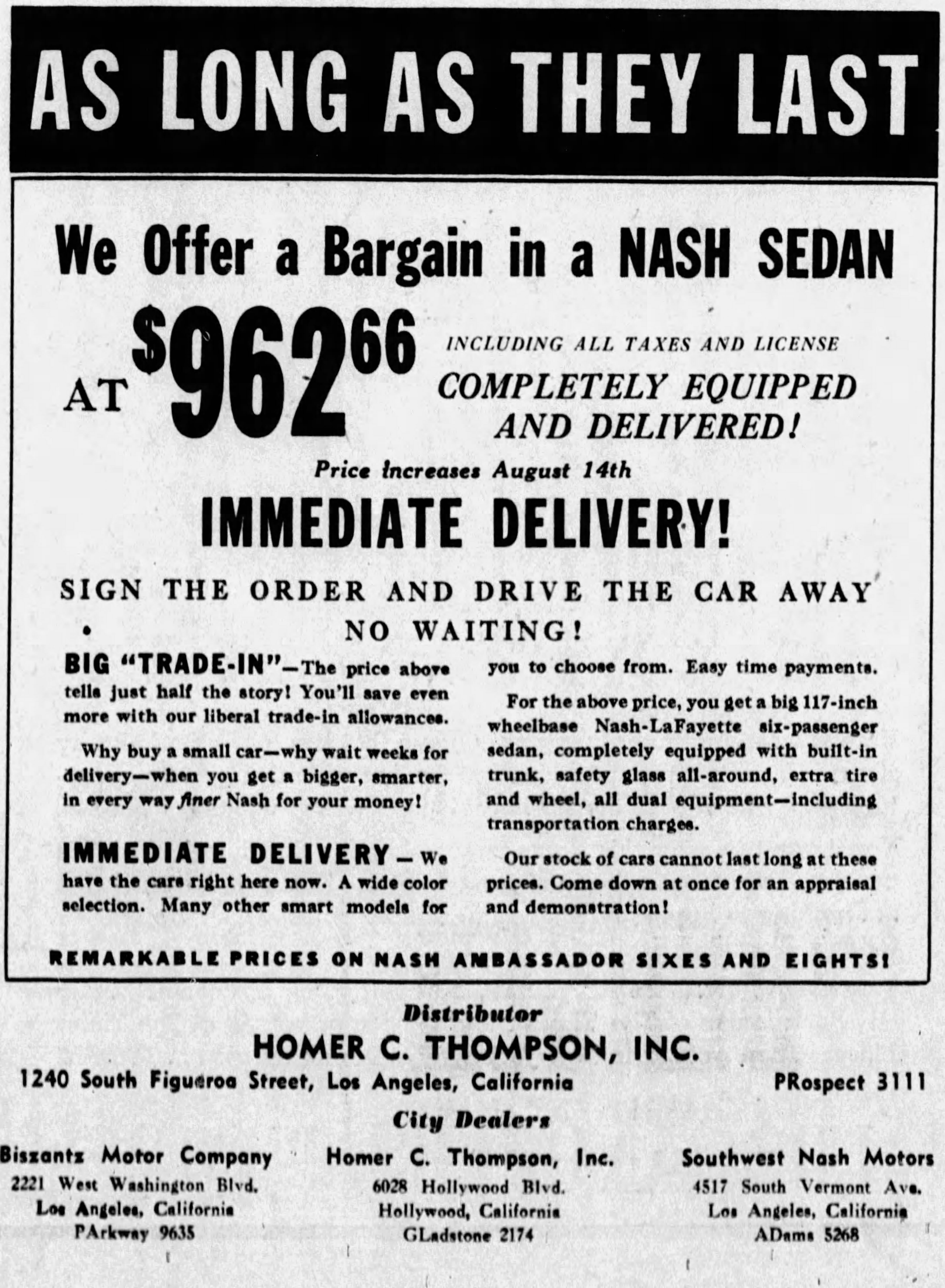On June 22, 1950 it became Hollywood Nash. Nash had previously operated next door at 6028 in 1936 to 1937 when 6032 was a Pontiac dealership. Nash Motors Co. had become Nash-Kelvinator Corporation in January 1937, and operated as the automotive division of Kelvinator, manufacturer of refrigerators and other appliances.