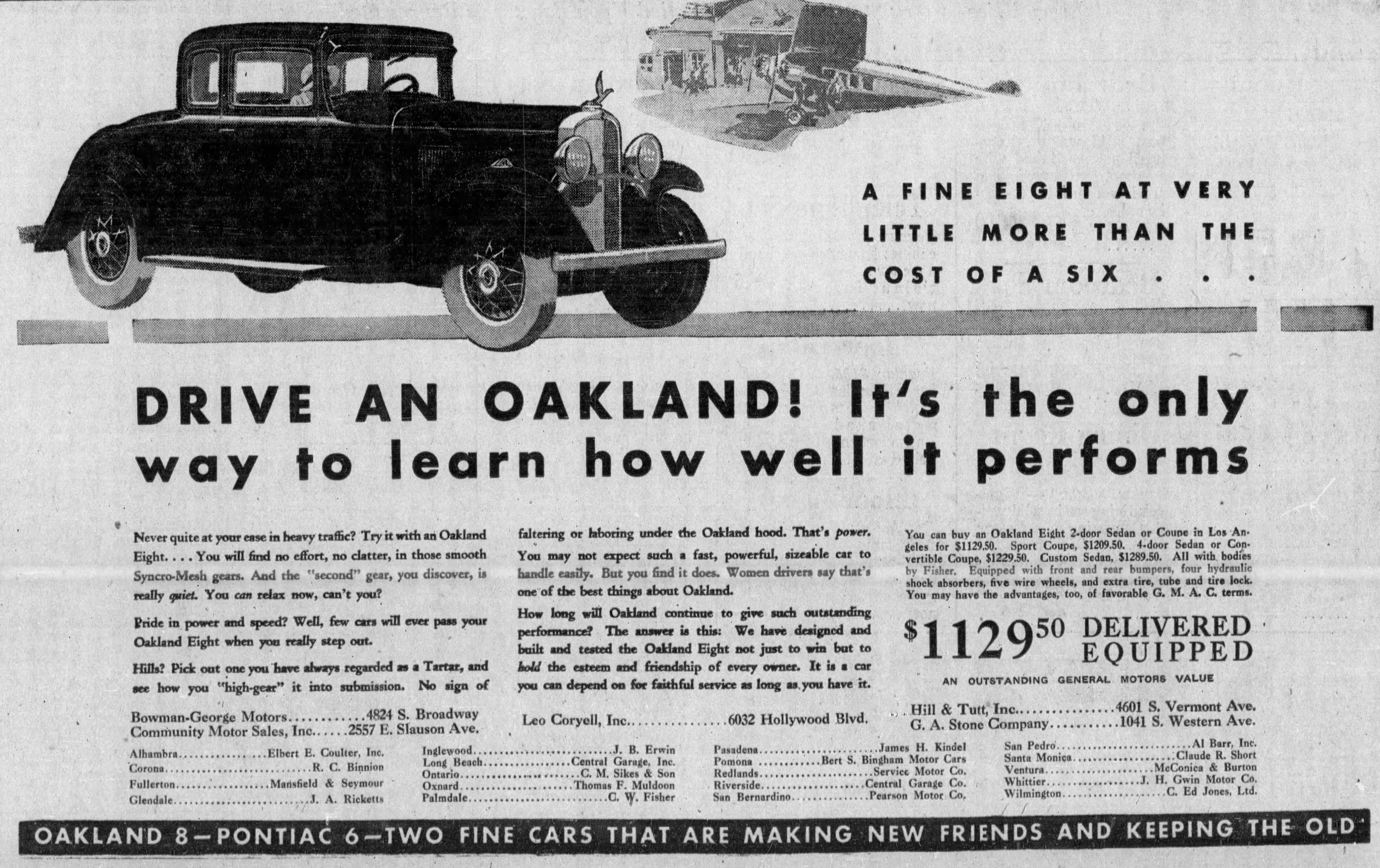 By 1927, Coryell was a dealer for Oakland and Pontiac automobiles. The Oakland Motor Car Company was founded in 1907 and purchased by General Motors (GM) in 1909. Pontiac was a also a GM brand, created in 1926.