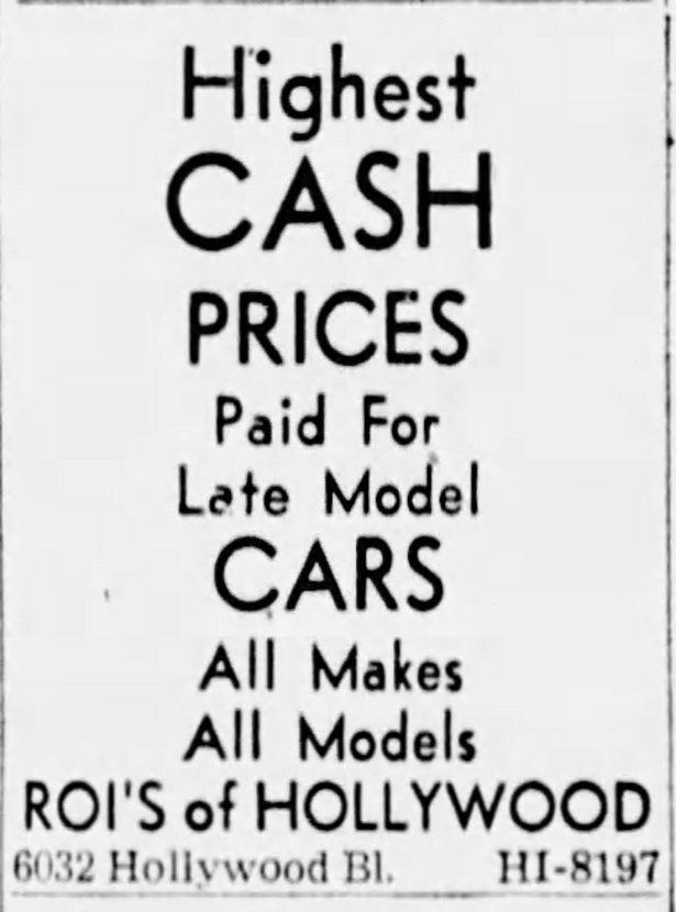 In March 1950, the building returned to automotive use as the showroom of “Roi’s of Hollywood” used cars. Roi’s remained here through early June 1950.