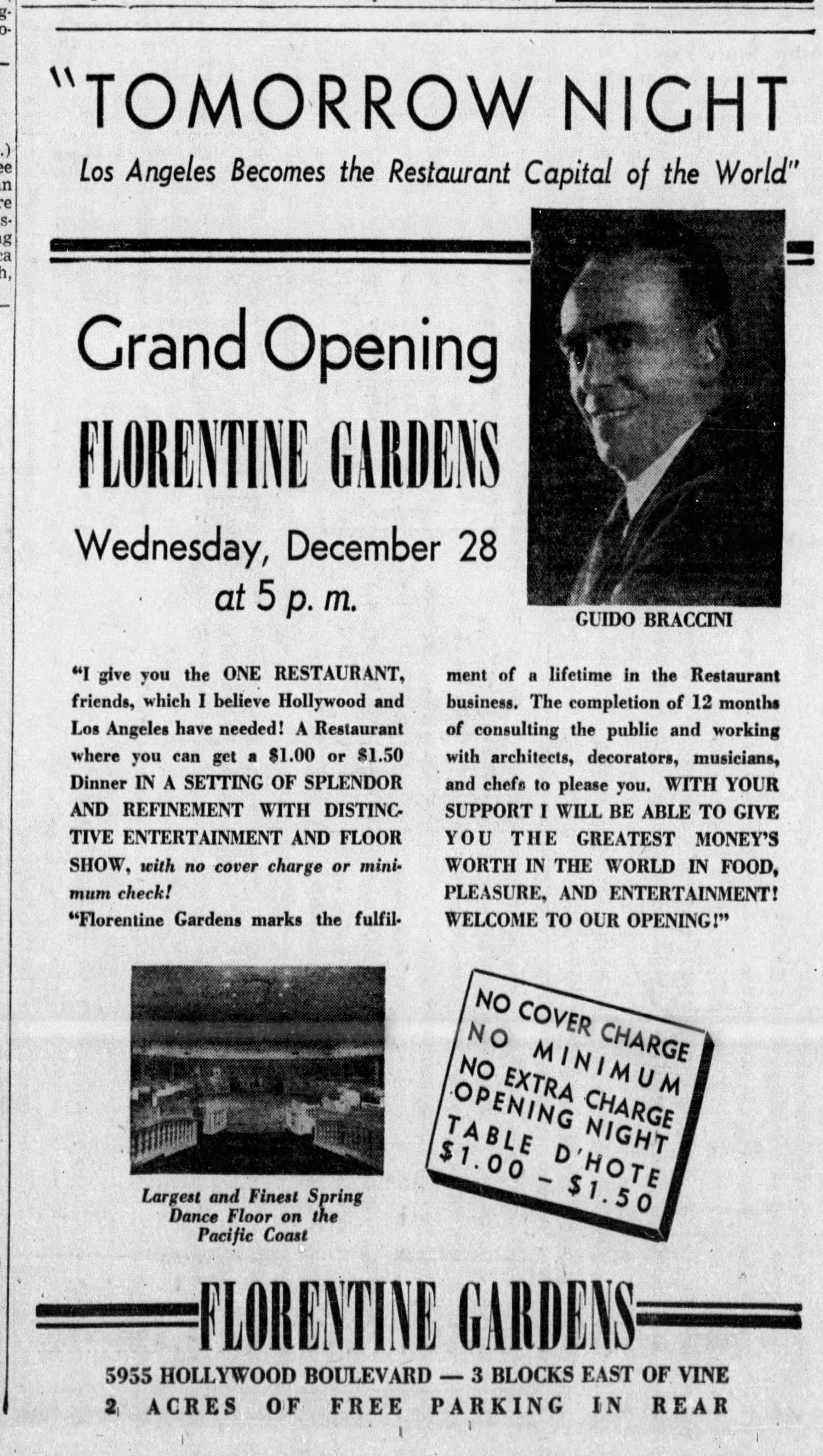Braccini was born in Italy in 1879. He came to the USA in 1903 and settled in San Francisco. He’d sold Italian statuary in the ‘teens and later founded Lucca’s Italian restaurant. A second Lucca’s opened in Los Angeles in 1933. Braccini sold his interest in Lucca’s before embarking on the Florentine Gardens project. The new restaurant would seat 1000 persons, with private banquet rooms and a dance floor that could hold 200 couples. Plus it had 2 acres of free parking.