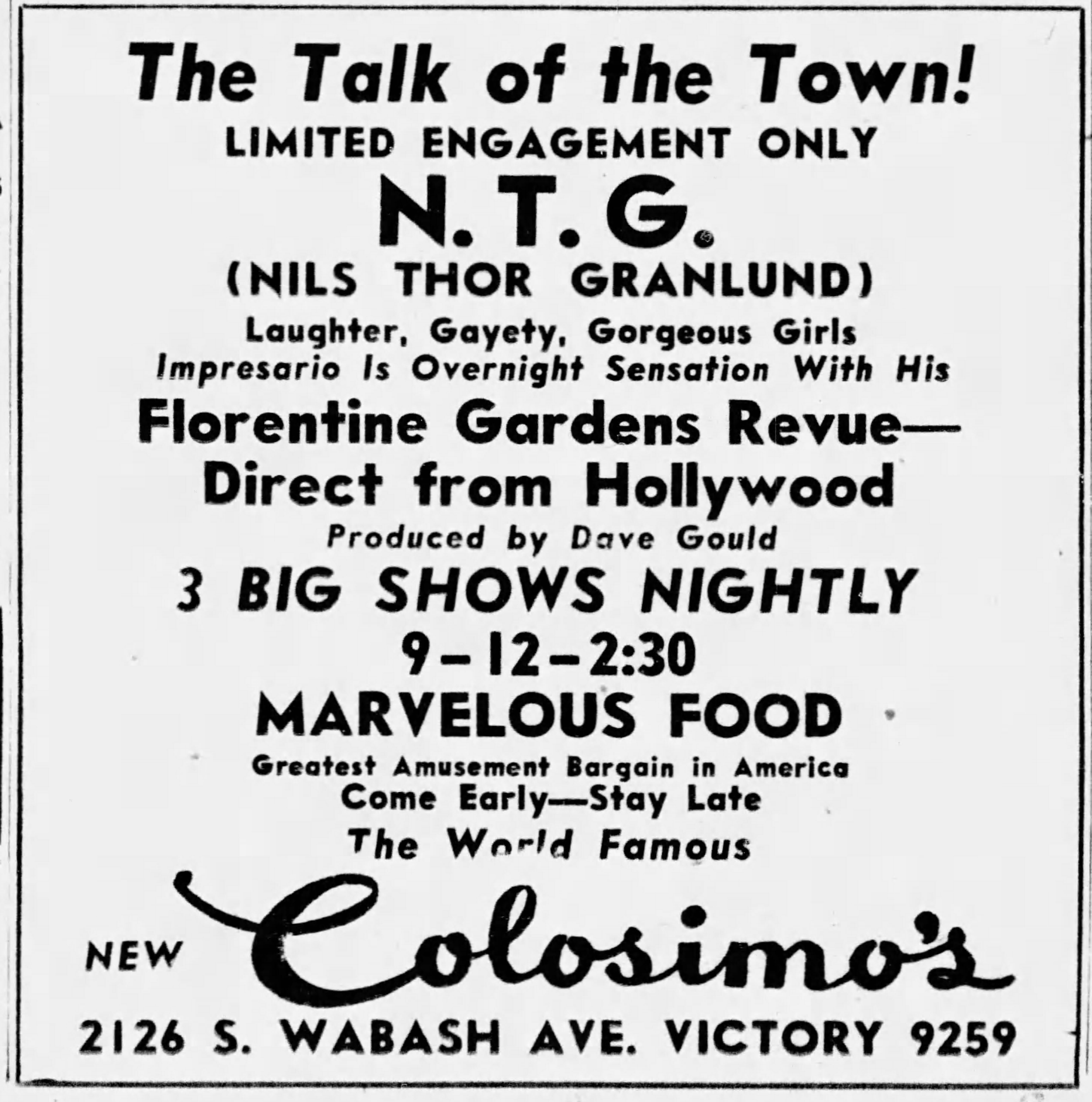 Granlund responded by telling syndicated gossip columnist Lou Sobol that he had been offered a half interest in Colsimo’s plus a “huge salary” to run the show their but that he had “decided” to return to Hollywood.