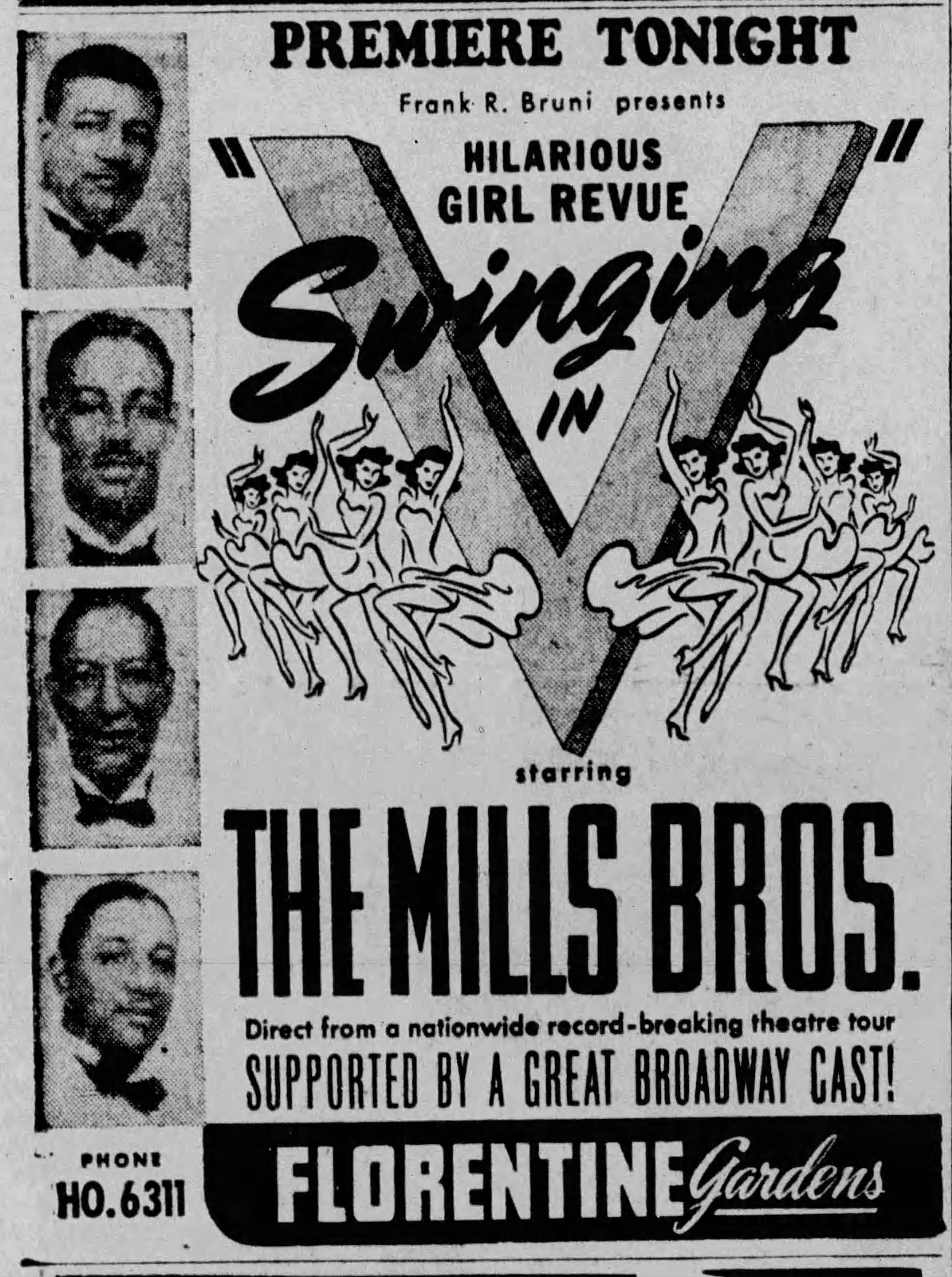 Having packed the Zanzibar room nightly in the Summer of ’42, the Mills Brothers made a triumphant return to the Florentine Gardens as headliners in 1945, having since recorded their smash hit, “Paper Doll.” Hollywood Citizen News 5/2/1945.
