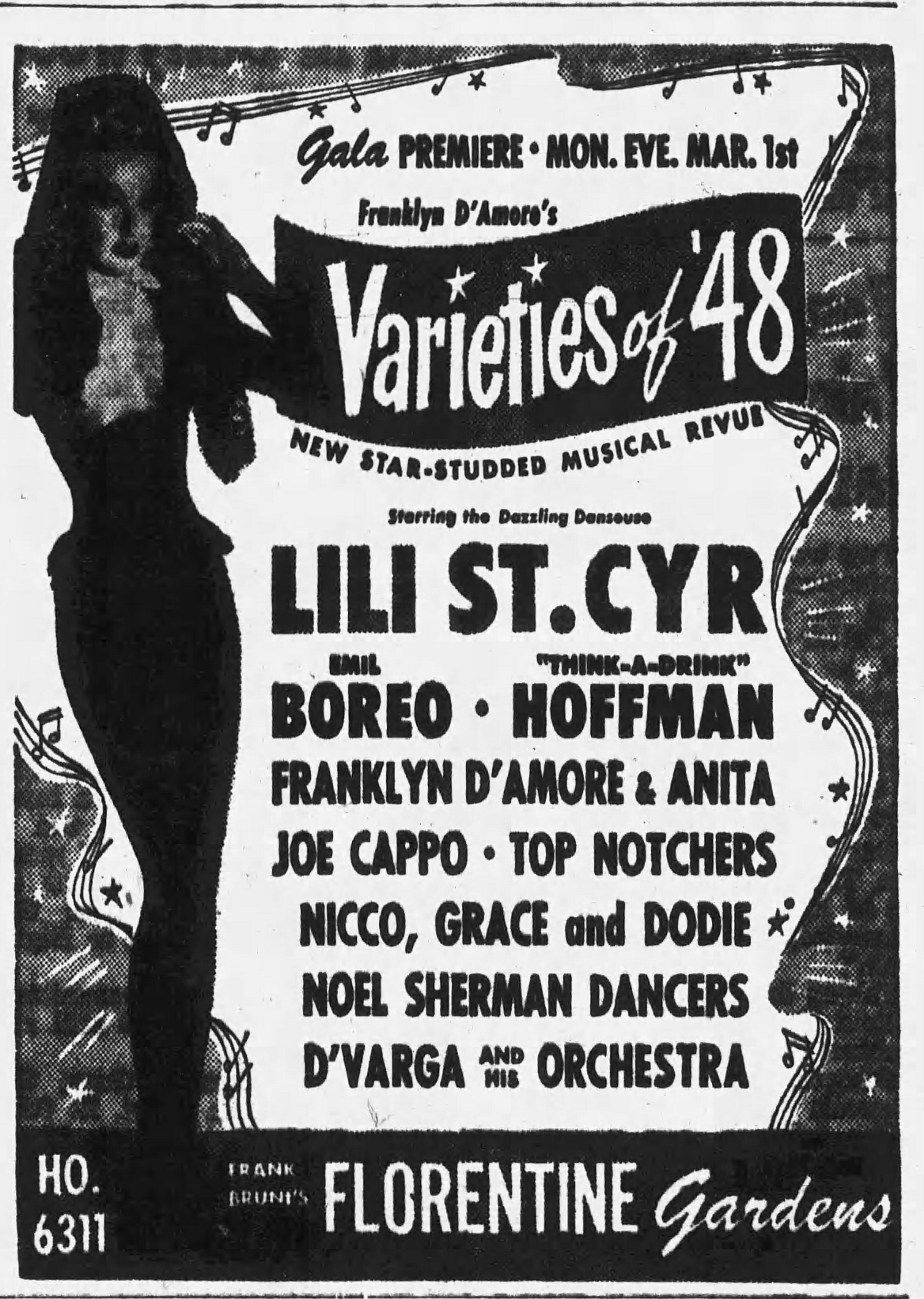 Lili St. Cyr made her return to the Florentine Gardens as a headliner on March 1, 1948. The show included “Think a Drink Hoffman” and Paul Valentine- St. Cyr’s husband at this time. Hollywood Citizen News 2/28/1948