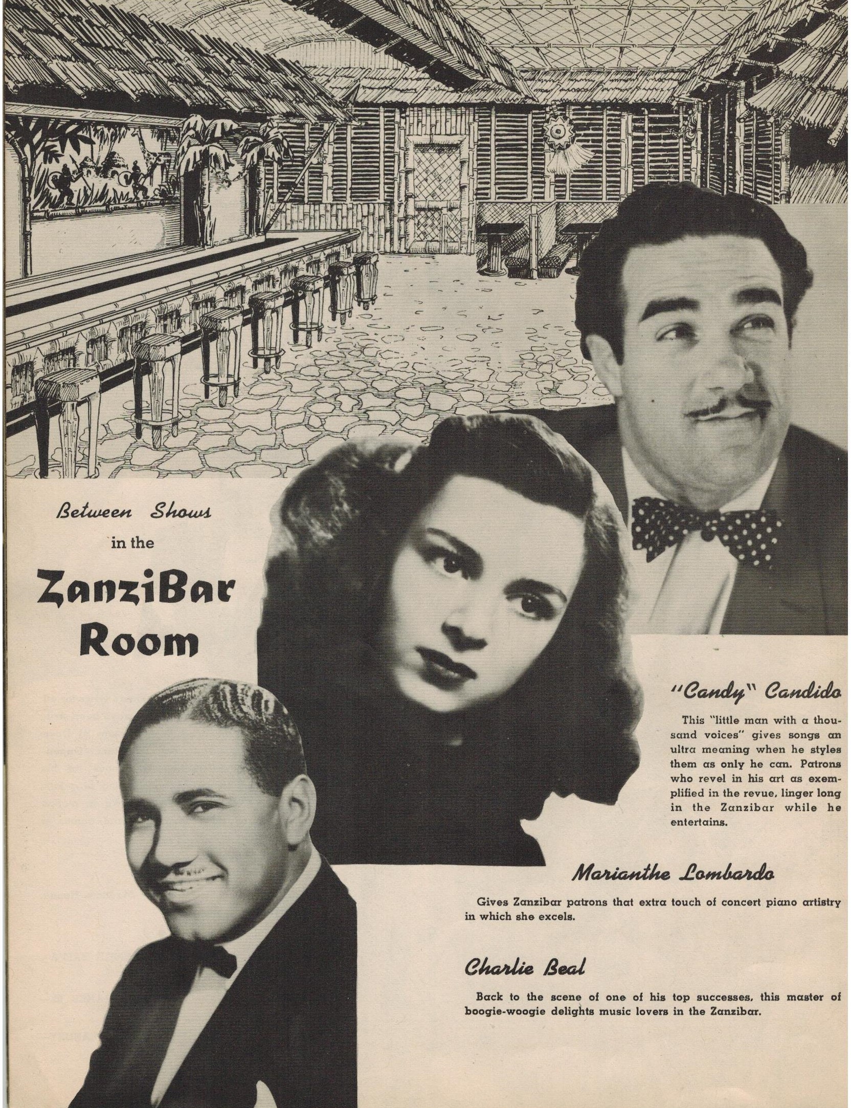 The Zanzibar Room, Florentine Gardens’ re-vamped jungle-themed cocktail lounge, opened in January 1942. The Mills Brothers opened in the Zanzibar Room on July 29, 1942 while NGT’s “Spirit of Victory” review played in the main showroom.