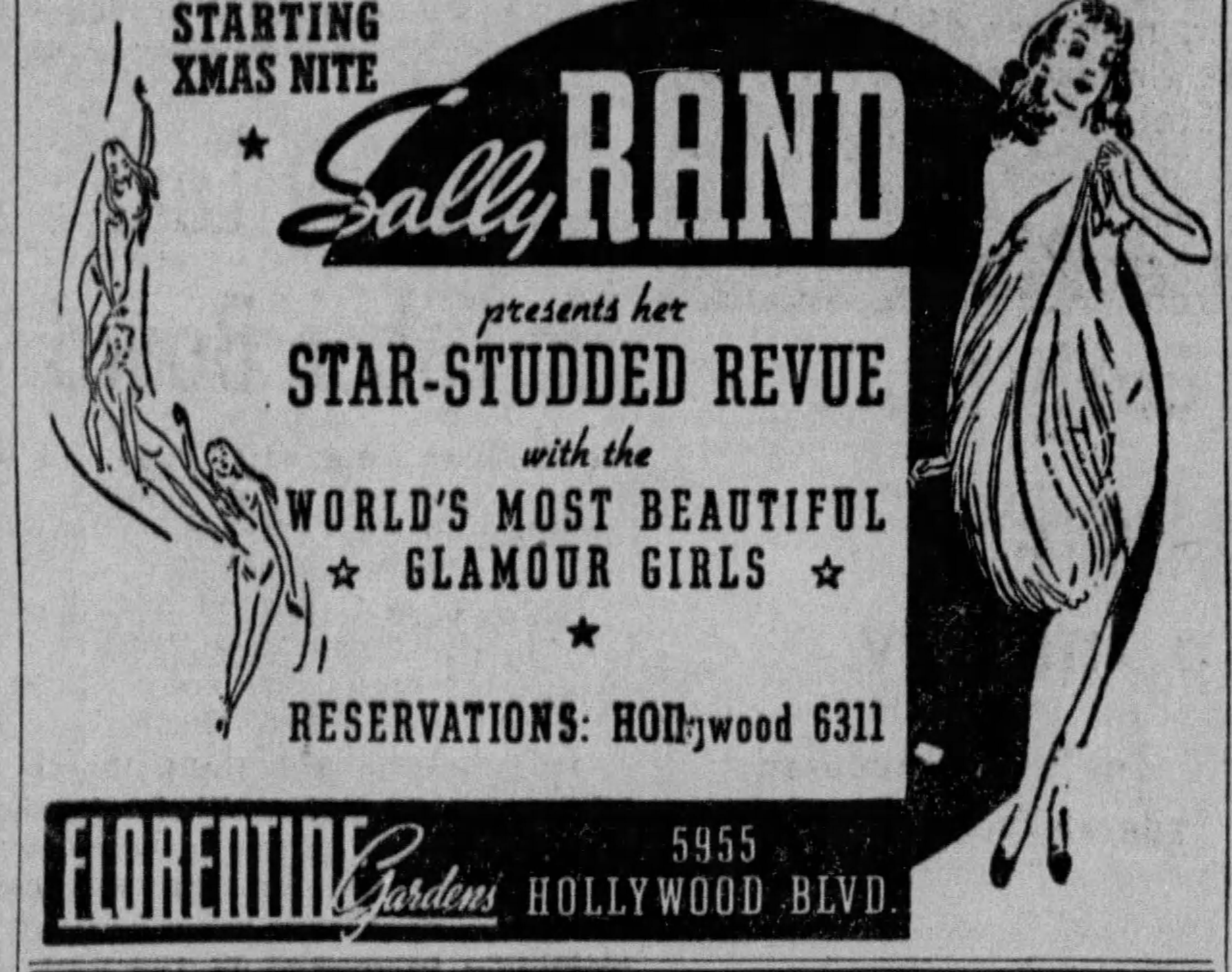 Famous fan dancer Sally Rand appeared at the Florentine Gardens between Christmas 1939 and New Years’ Day 1940. (She needed cash). LA Times 12/23/1939.