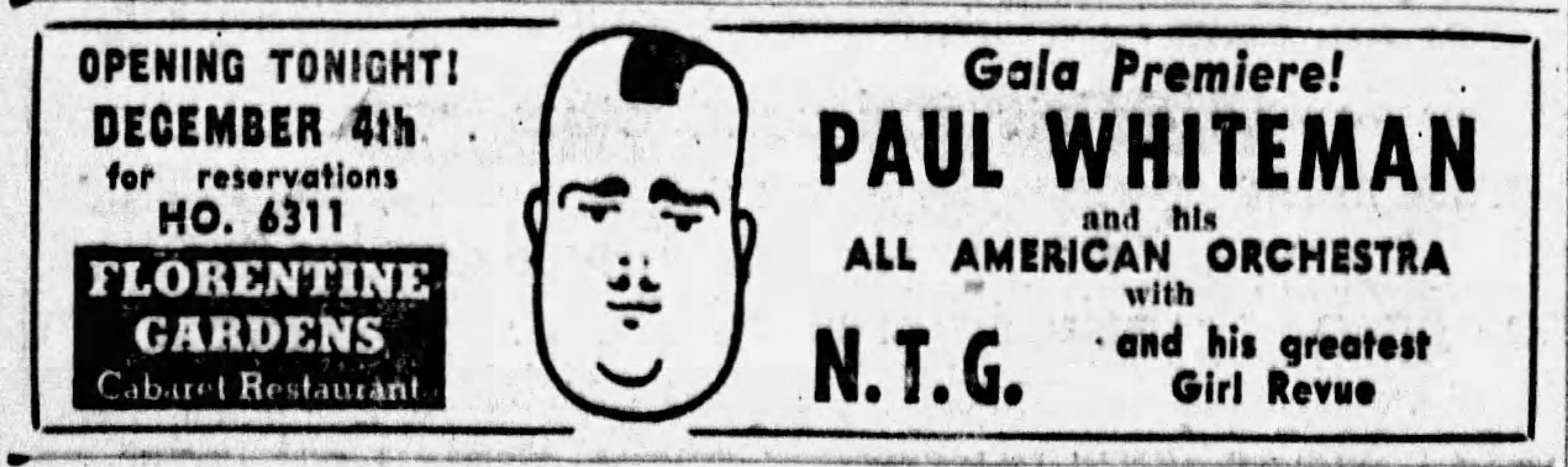 Celebs packed the audience for the opening of King of Jazz Paul Whiteman at Florentine Gardens December 4, 1941. Three days later, the US was at war. The war years were boom times for Gardens and other nightclubs.