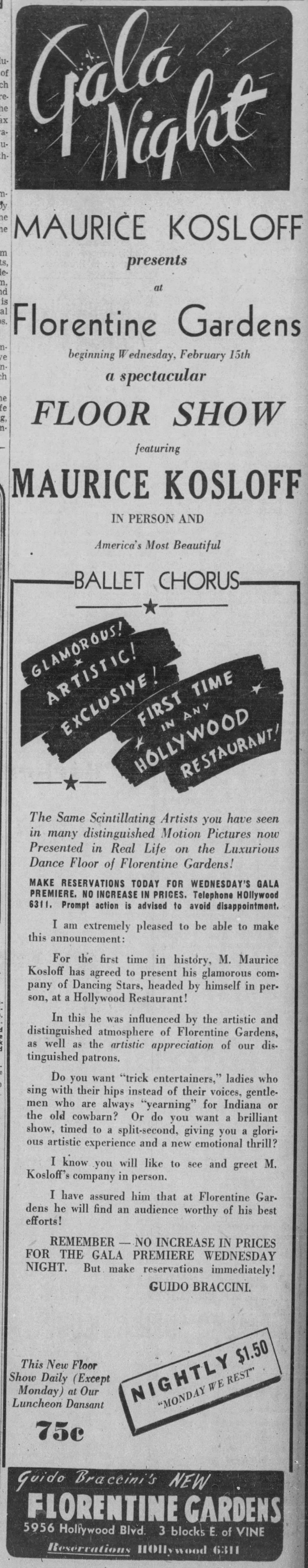 On February 15, 1939, dance instructor Maurice Kosloff staged a classical ballet floor show at the Florentine Gardens. In general, though, the venue tended to operate more as a restaurant with entertainment as a sideline. That would change in the new year.