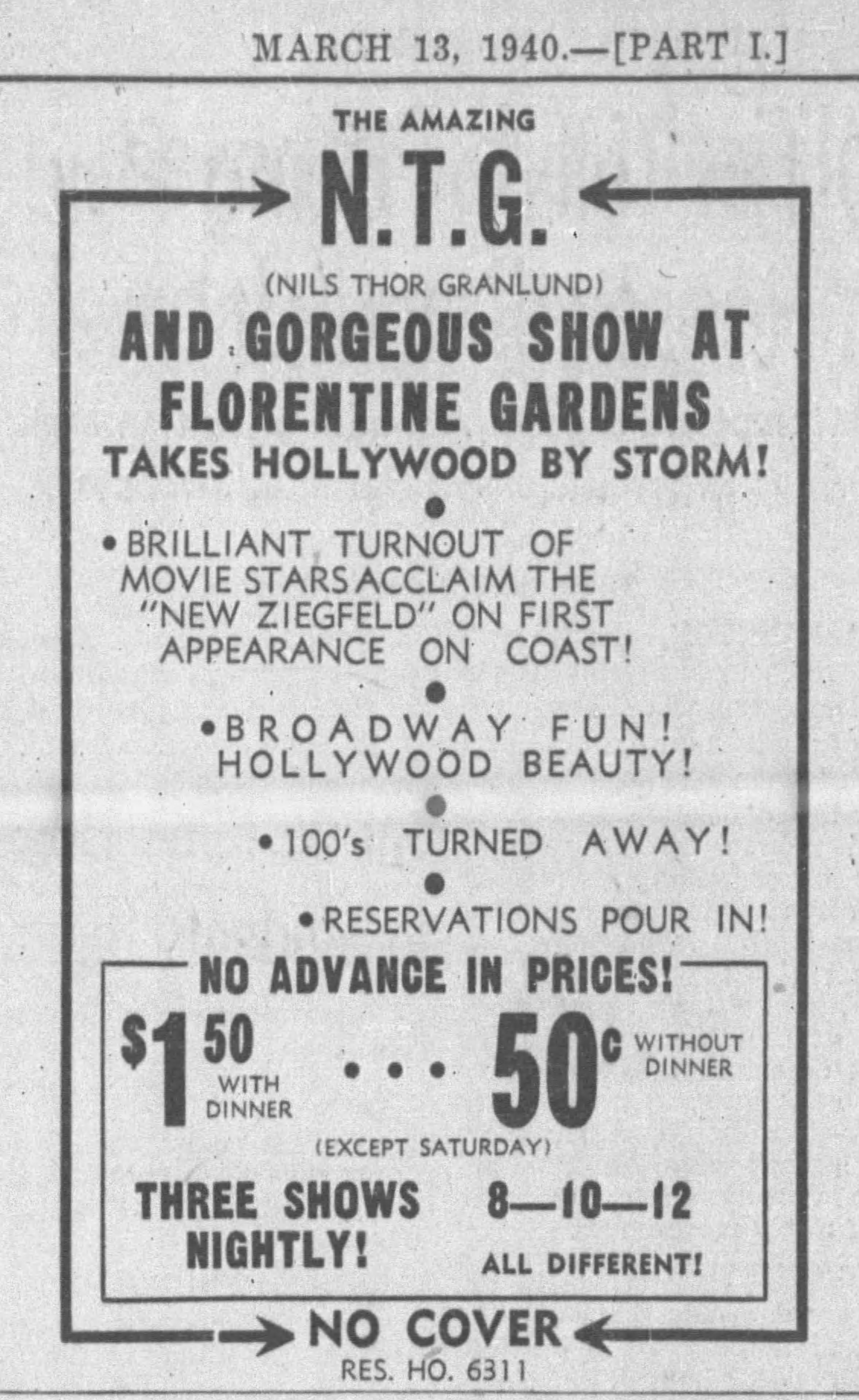 NTG’s first show for Florentine Gardens, on March 10, 1940, was called, fittingly, “Hello Hollywood.” He wasn’t shy about self promotion .