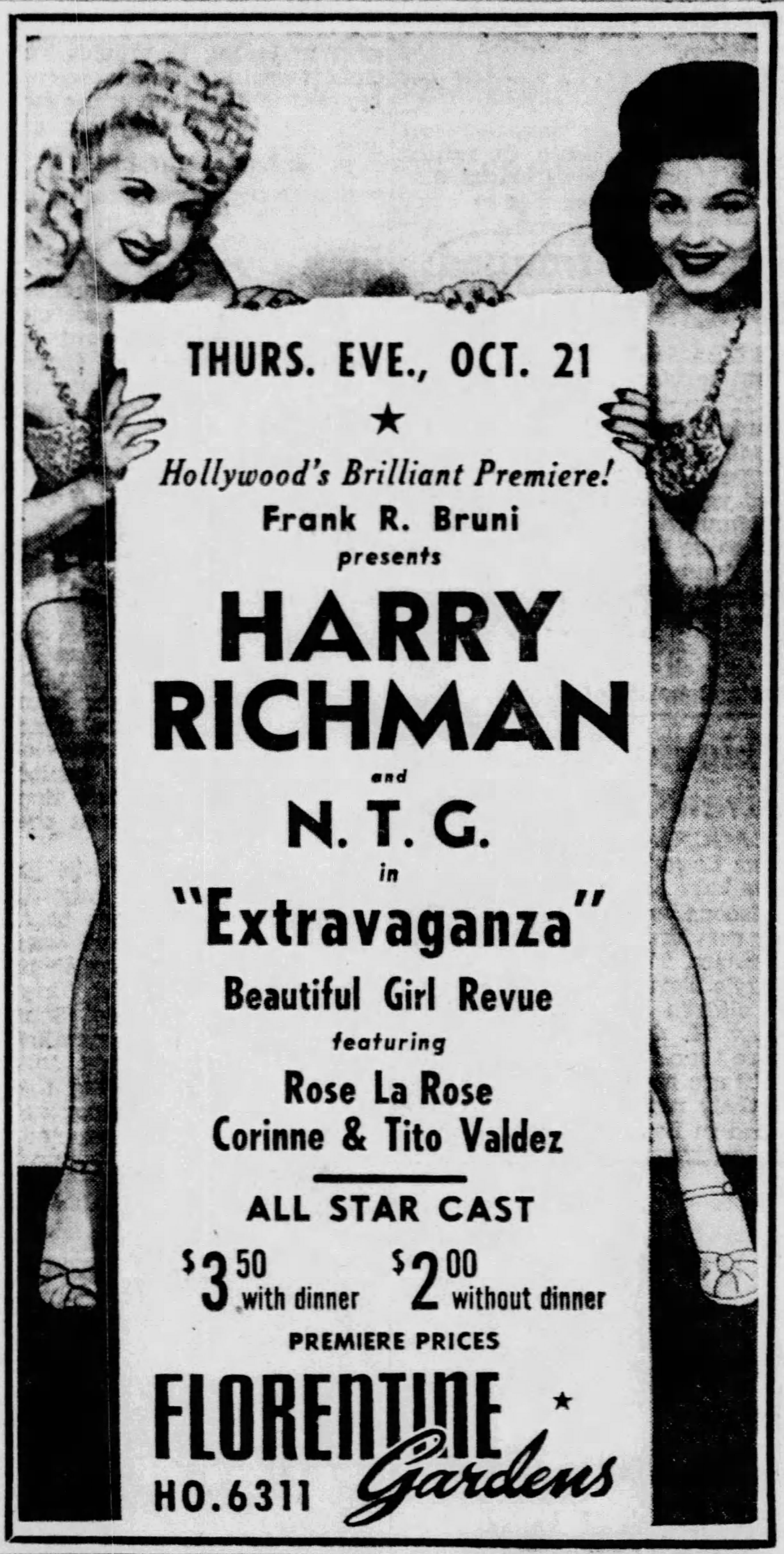 NTG often booked talented artists he had known in the old Broadway days like Sophie Tucker, Ted Lewis and Harry Richman. LA Times 10/20/1943