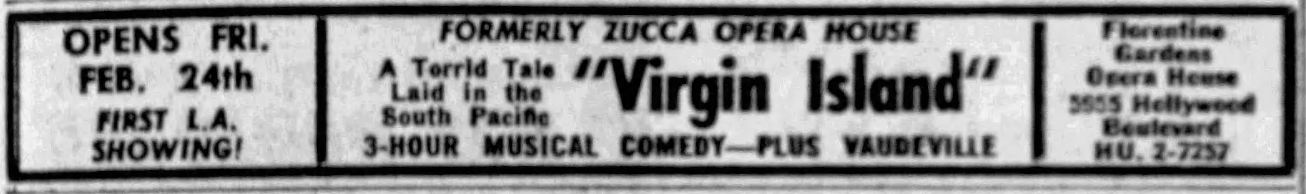 On February 20, 1950, Zucca’s Opera House burned down just before its new review, “Virgin Island,” was to open. The show must go on, however; Hansen and Zucca struck a deal and on February 24, it opened for a show to benefit the actors at the Florentine Gardens, renamed Florentine Gardens Opera House. The show then moved to the Paddock Club, a former ballroom on Riverside Drive.