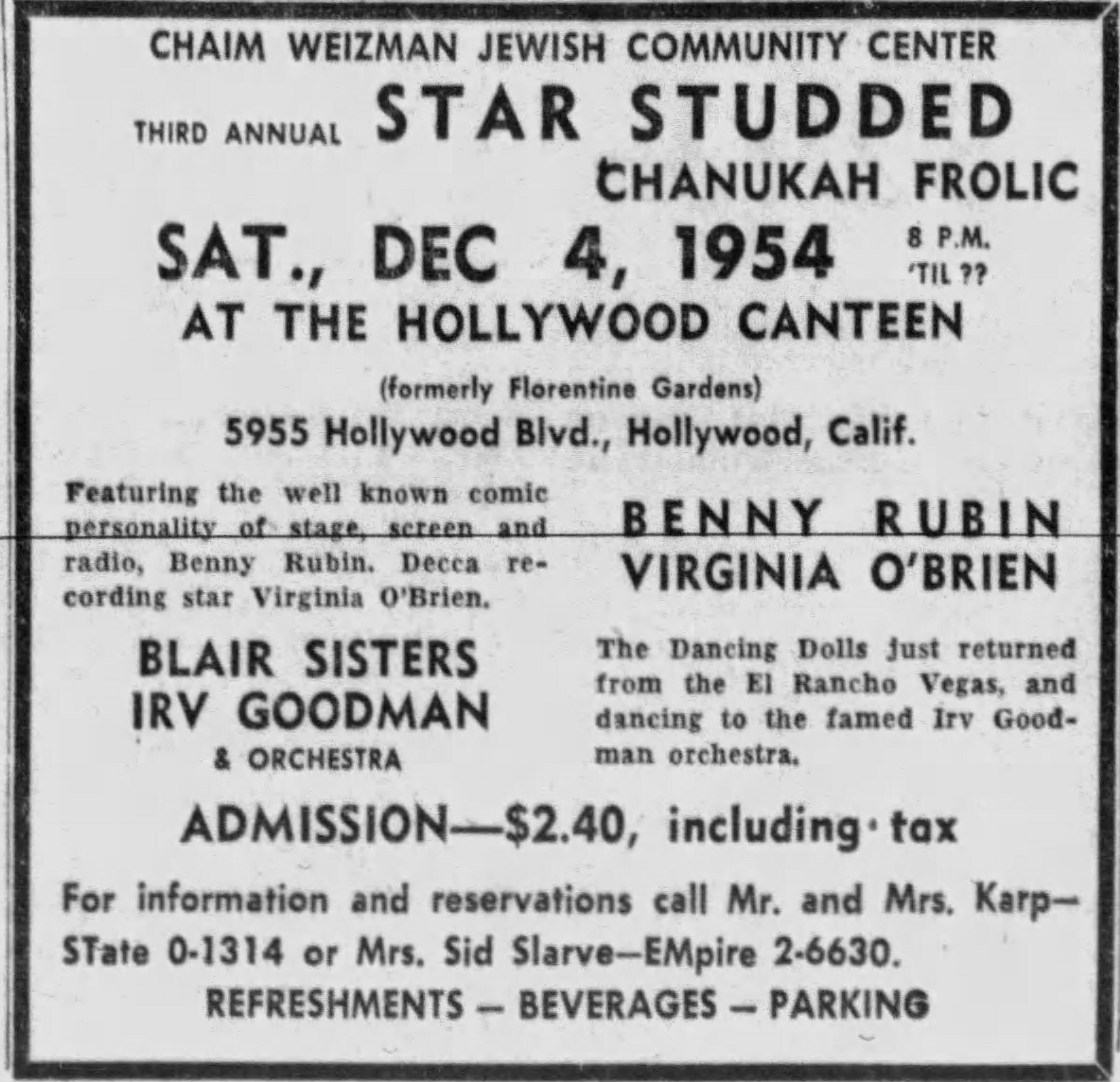 The Hollywood Canteen Foundation, owners of the Florentine Gardens, rented the building for special events while planning to reopen it as the new Hollywood Canteen. Hollywood Citizen News 4/3/1952.